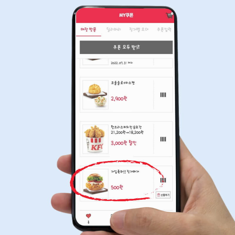 KFC 앱을 다운받고 회원가입을 하면 다양한 쿠폰이 지급되는데요. 그중 한 가지가 징거버거 500원 쿠폰입니다.