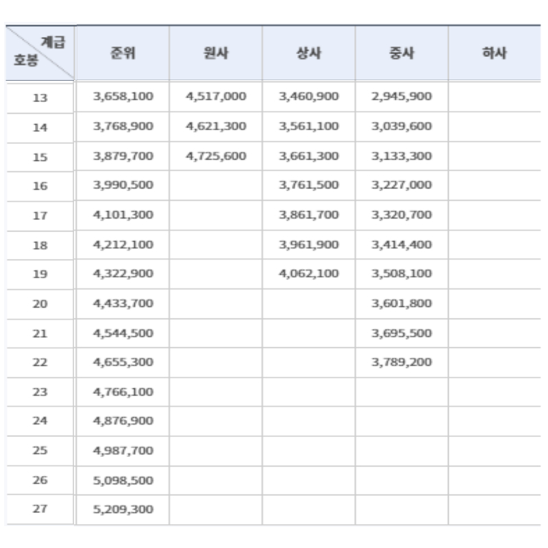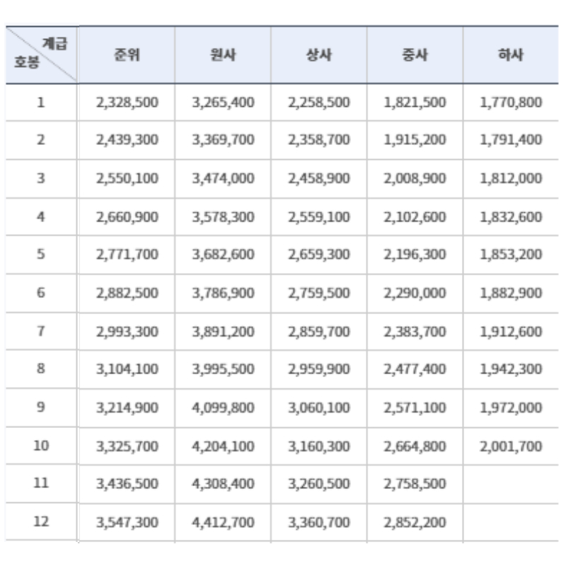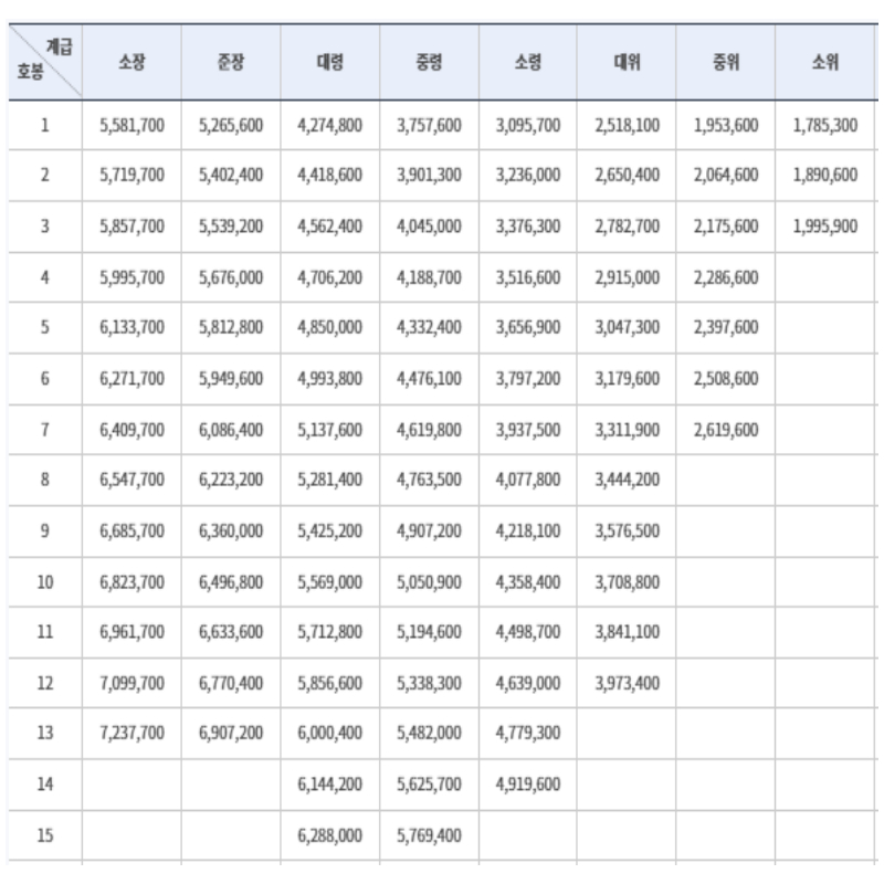 장교와 준위, 부사관은 인사혁신처에서 제공하는 봉급표를 기준으로 호봉별로 지급합니다.