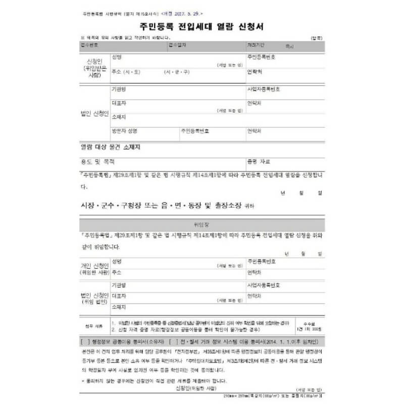 공통적으로는 주민등록 전입세대 열람 신청서와 대리 신청 시 위임장을 제출해야 합니다.