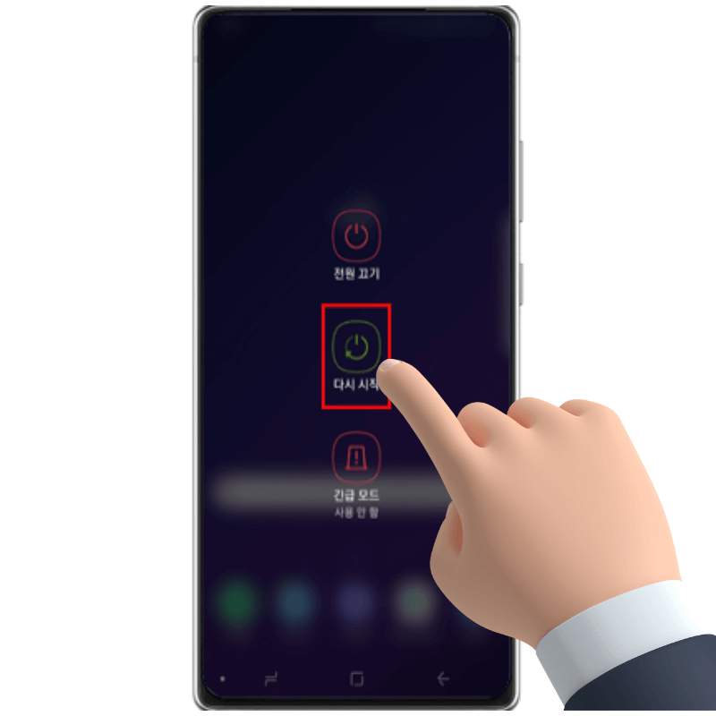 재부팅은 전원버튼을 길게 누르면 3가지 선택 아이콘(전원 끄기 / 다시 시작 / 긴급 모드)이 나오는데 '다시 시작'을 선택하면 됩니다.