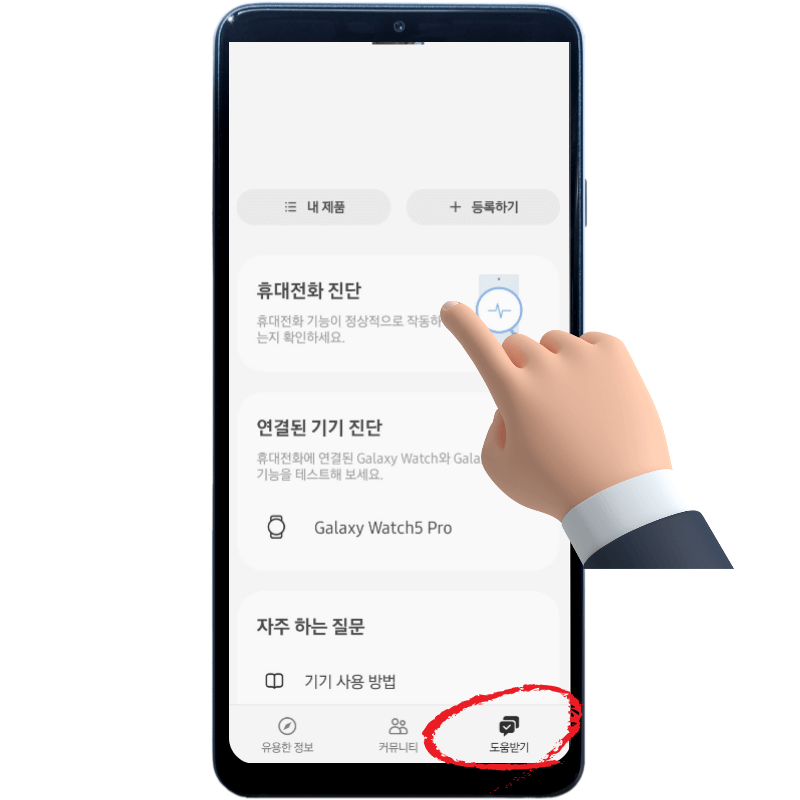 ② 화면 하단에 위치한 '도움받기'를 선택 후 '휴대전화 진단'을 선택합니다.