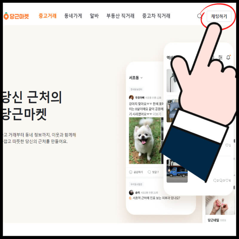 당근마켓 pc버전은 홈페이지 접속하여 이용할 수 있습니다. 당근마켓 홈페이지 접속 후 오른쪽 상단에 위치한 '채팅하기' 버튼을 선택합니다.
