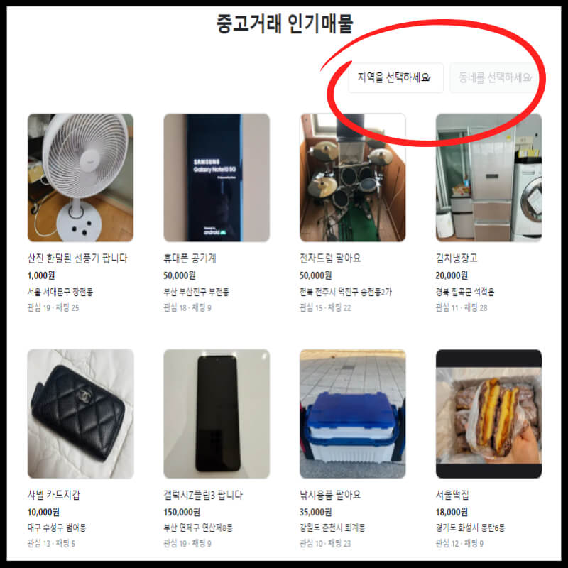 지역을 선택 후 세부 동네 정보를 입력하면 설정한 동네의 매물을 확인할 수 있습니다.