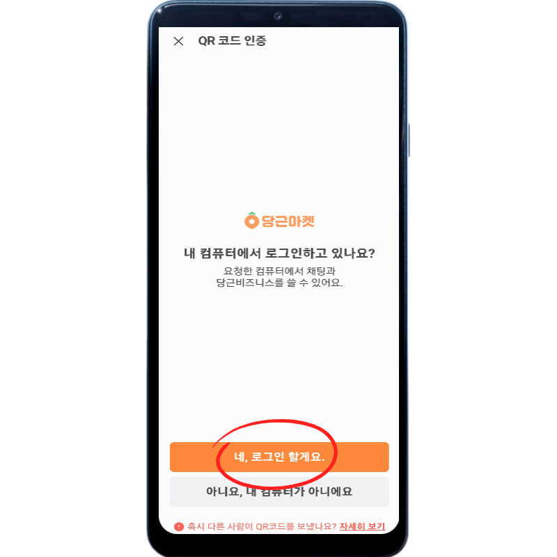 pc 모니터 화면에 QR 코드를 스캔 하면 로그인 여부를 묻는 페이지가 나오는데 '네, 로그인 할게요'를 선택합니다.