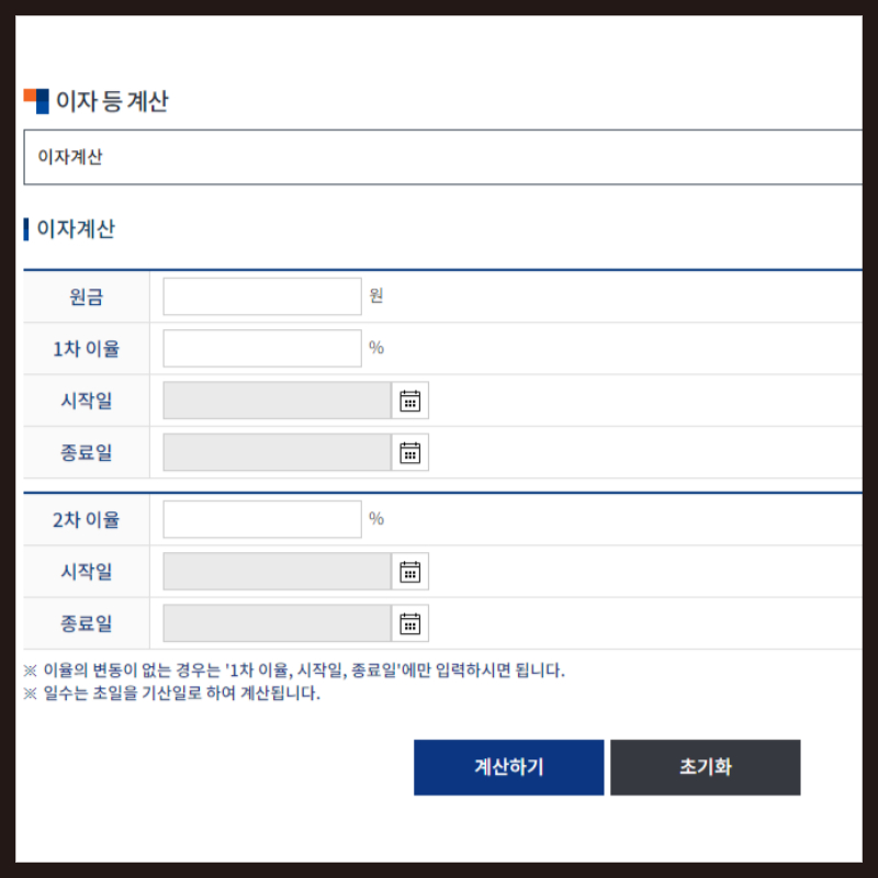 2차 이율도 마찬가지로 연체된 월의 연체이율을 입력하면 됩니다. 시작일은 연체된 월세 지급 기일 다음날을 입력합니다.
