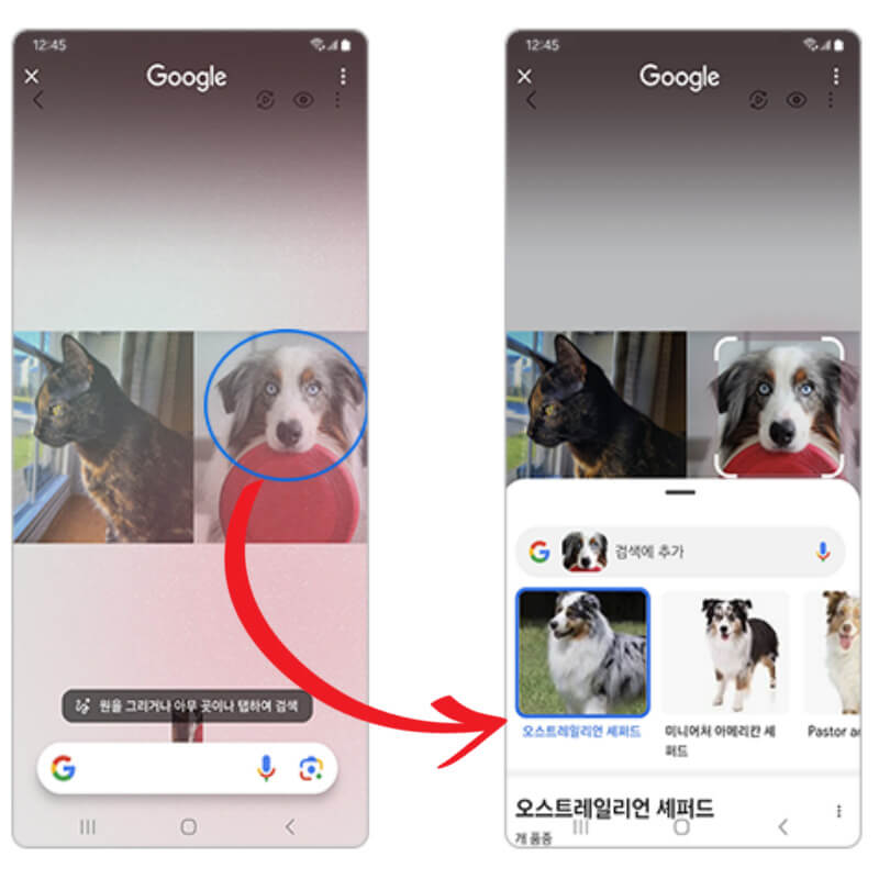 구글 검색으로 전환되면 s펜이나 손가락으로 검색하고자 하는 이미지나 글씨에 원을 그리면 검색이 진행됩니다.