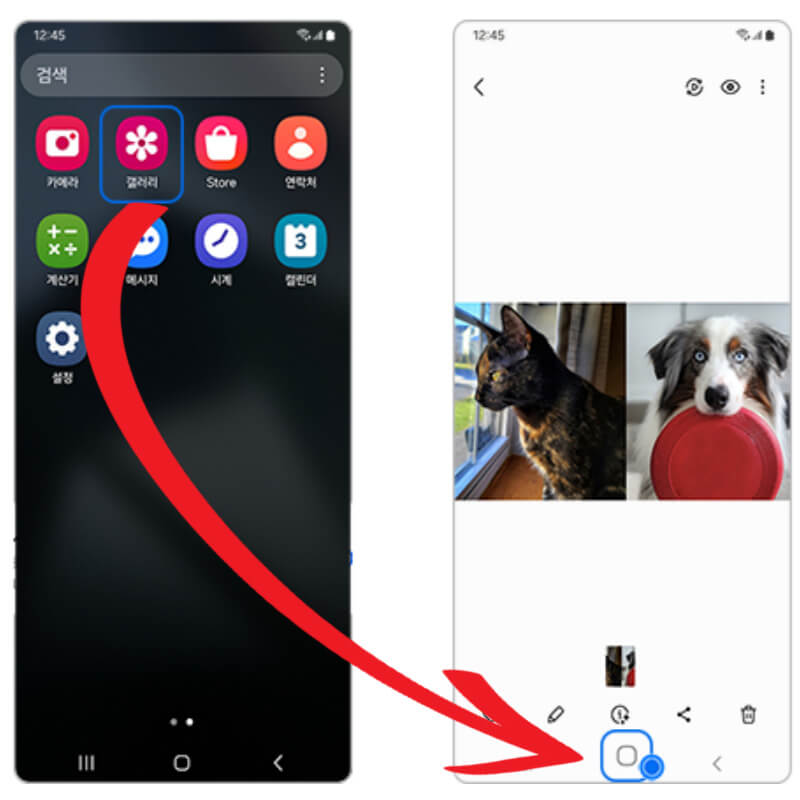 갤럭시 갤러리리 앱을 선택 후 검색하고자 하는 이미지에서 홈키를 길게 눌러 구글 검색으로 전환합니다.