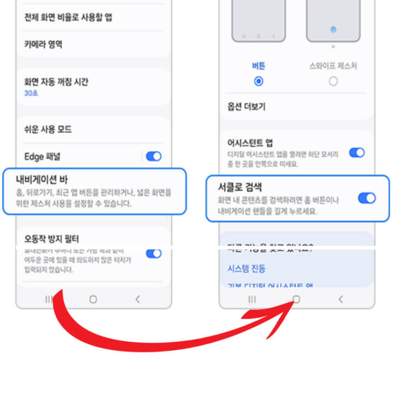 디스플레이를 선택하면 아래 '내비게이션 바' 메뉴가 있습니다. 이를 선택 후 '서클로 검색' 메뉴를 활성화합니다.