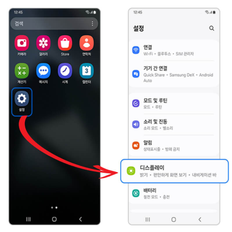갤럭시 설정을 선택 후 디스플레이를 선택합니다.