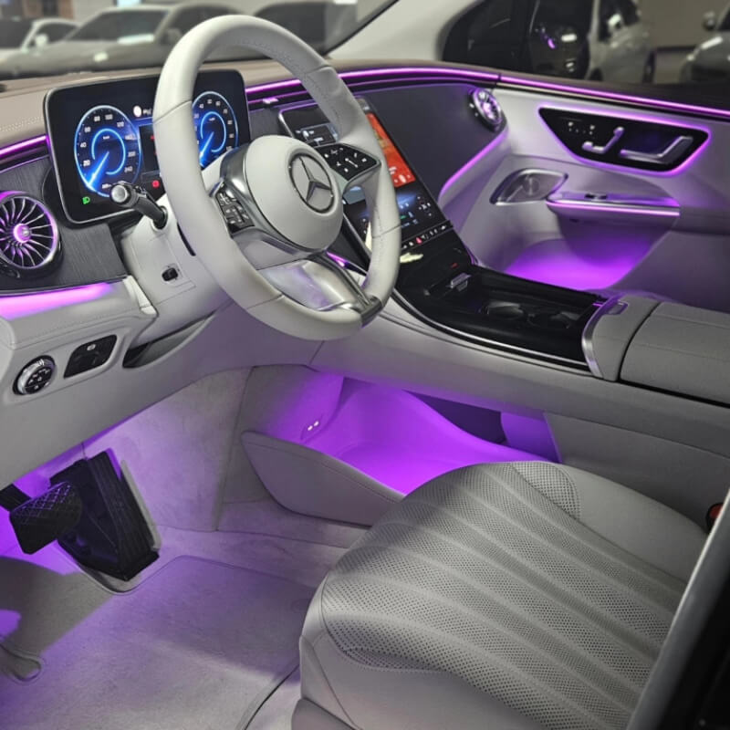 EQE SUV는 나이트 클럽 같은 엠비언트 라이트, 뒷바퀴 조향, 에어 서스펜션 등 고급 옵션을 탑재하고 있습니다.