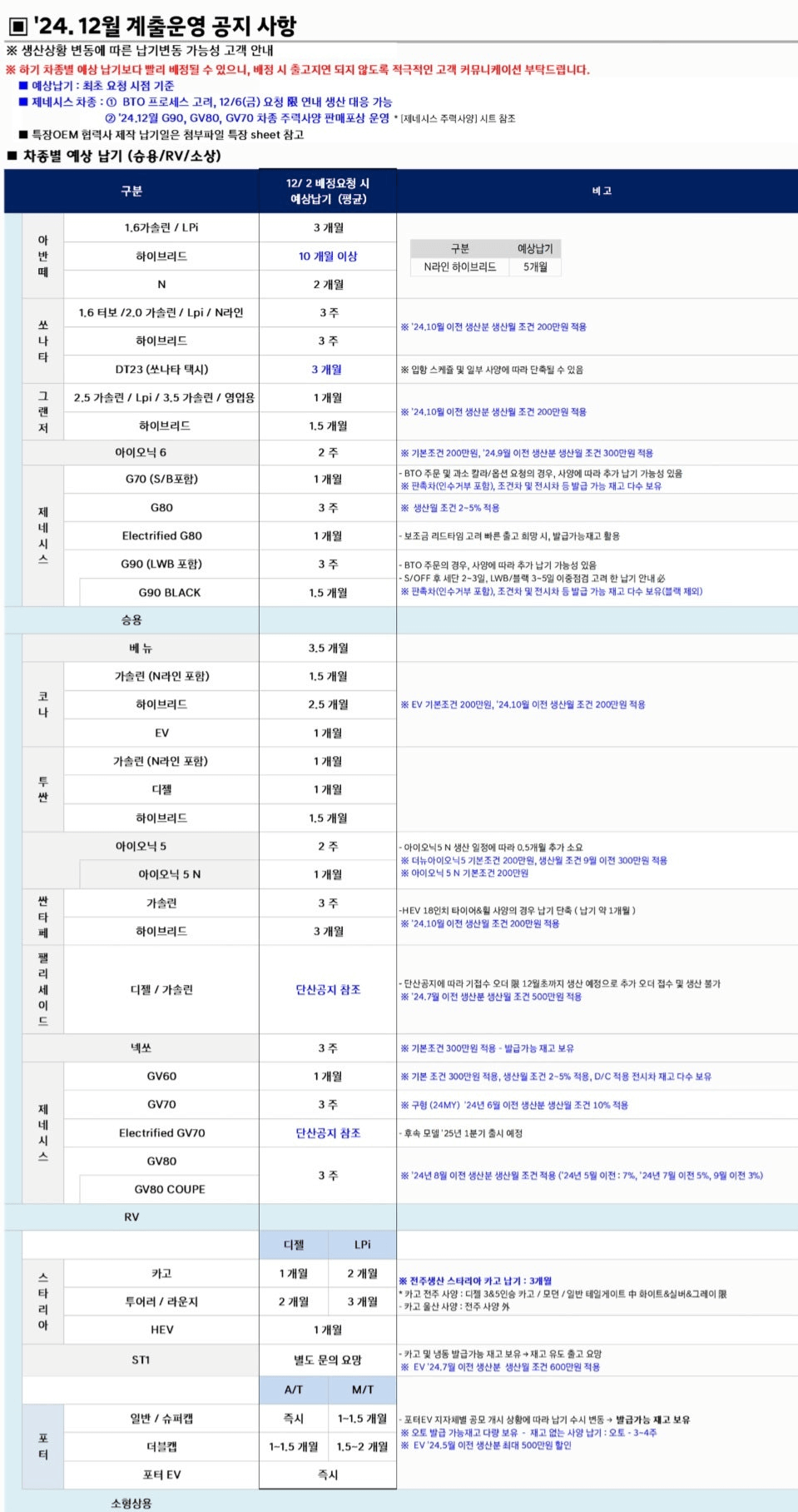 현대자동차(제네시스) 출고 납기 일정 24년 12월 기준