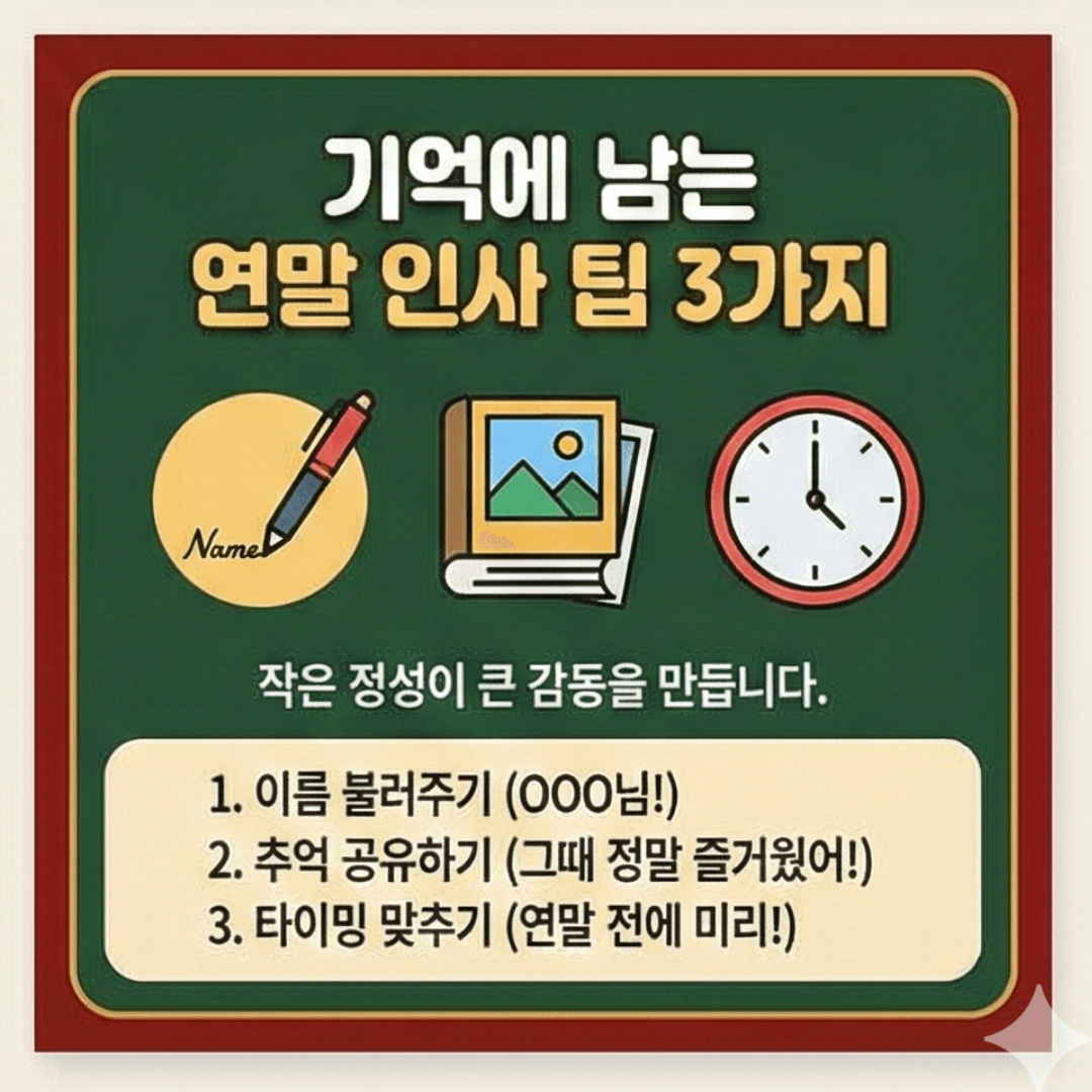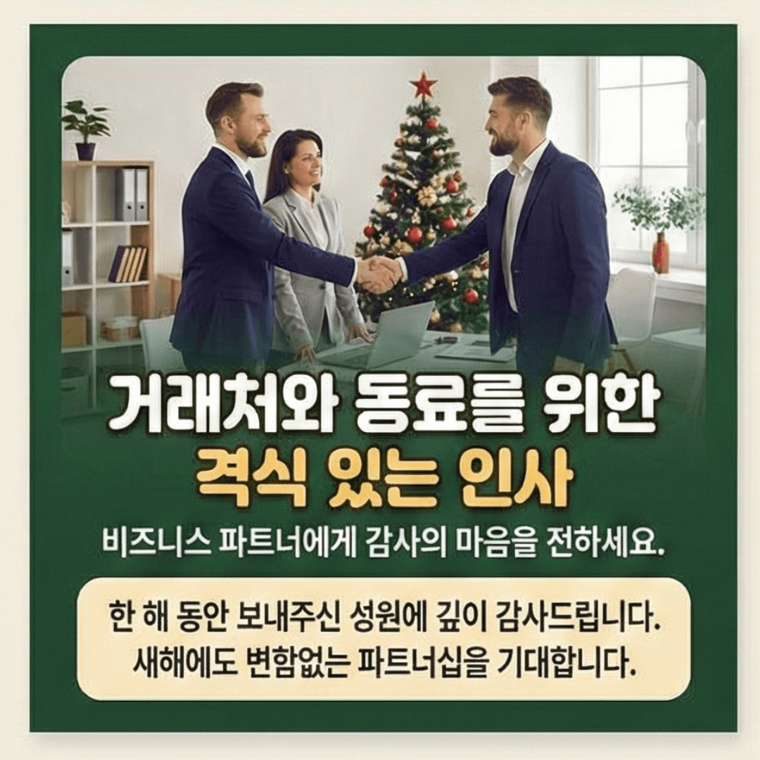 - 타이밍 선정: 12월 31일은 메시지가 폭주하는 날입니다. 오히려 크리스마스 전후나 12월 중순쯤 미리 인사를 건네면 더 여유롭고 세심한 인상을 줄 수 있습니다.