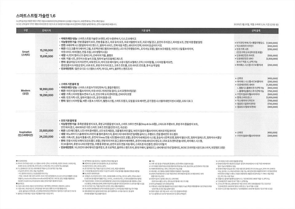 그런데 이번에는 가솔린 최상위 트림인 인스퍼레이션과 LPi 최상위 트림인 모던에서 선택품목을 최대로 넣어본 결과 아래 표와 같이 나왔습니다.