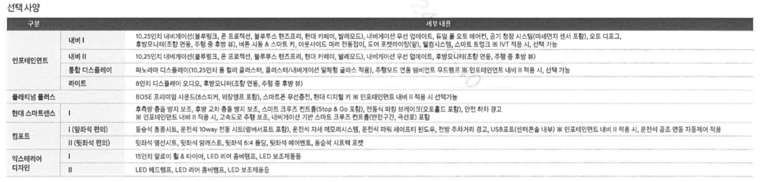 10.25인치내비게이션(블루링크,폰프로젝션,블루투스핸즈프리,현대카페이,무선업데이트),BOSE프리미엄사운드(8스피커,외장엠프) |