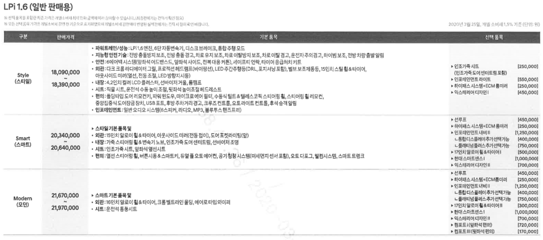 그래서 가솔린과 LPi 풀옵션을 비교해보았습니다.