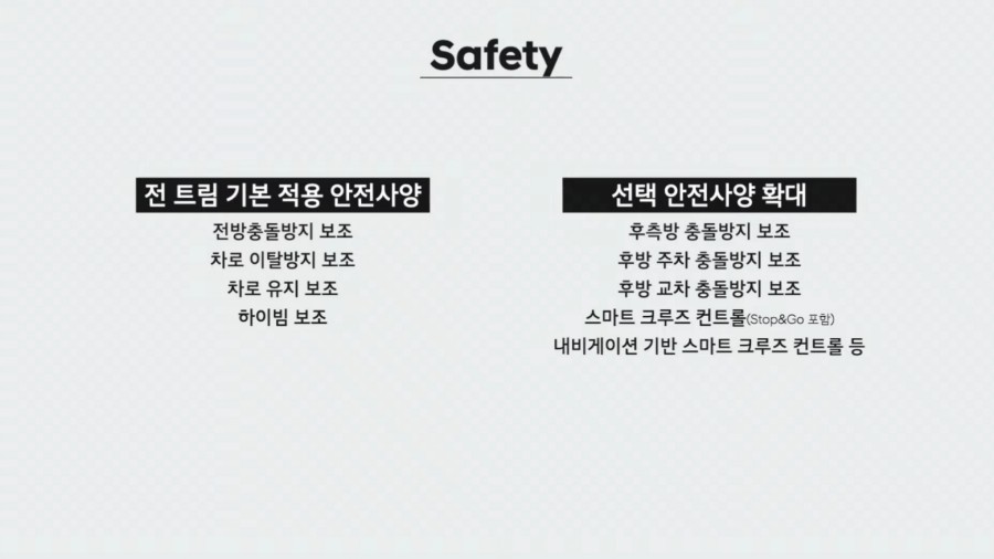 전방충돌방지보조,전방충돌경고,차로유지보조,차로이탈방지보조,차로이탈경고,운전자주의경고,하이빔보조,전방차량출발알림, 후측방충돌방지보조,후방교차충돌방지보조,스마트크루즈컨트롤(stop&go포함),고속도로주행보조,후방주차충돌방지보조,안전하차경고,내비게이션기반스마트크루즈(안전구간,곡선로) |