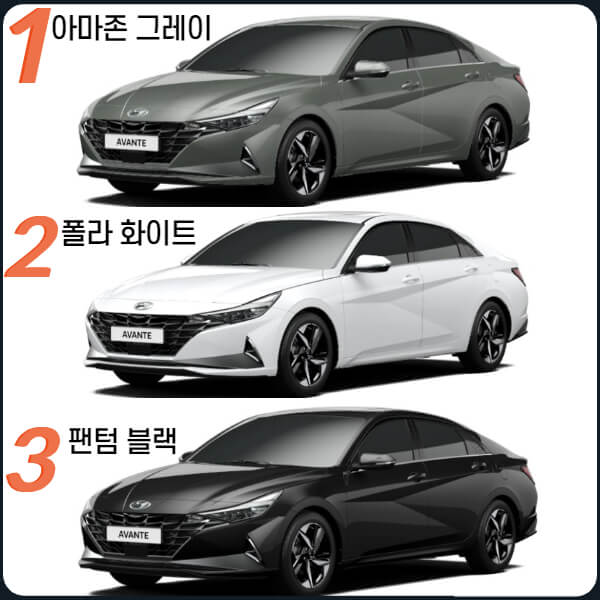 아반떼 cn7 색상 추천 고민해결! 아반떼 cn7 색상은 총 9가지로 가장 인기 있는 색상은 아마존 그레이, 폴라 화이트, 플루이드 메탈입니다. 그리고 내장 색상은 블랙과 그레이로 2가지인데, 그레이