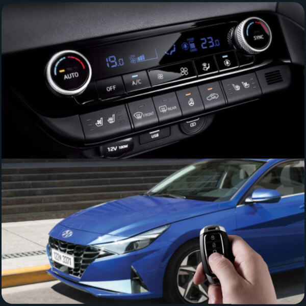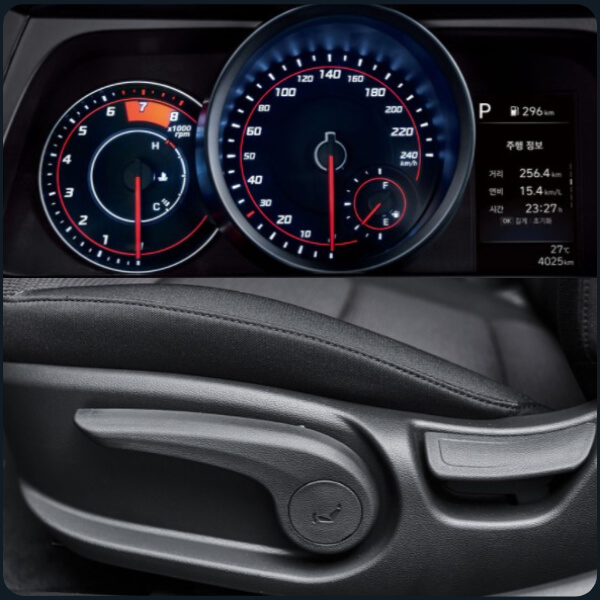 버튼 시동 스마트키, 스마트키 원격 시동, 듀얼 풀 오토 에어컨, 공기 청정 시스템, OTA 블루링크 폰 프로젝션 등 기능이 첨가된 10.25인치 내비게이션, 스마트 트렁크, 후방 모니터입니다.
