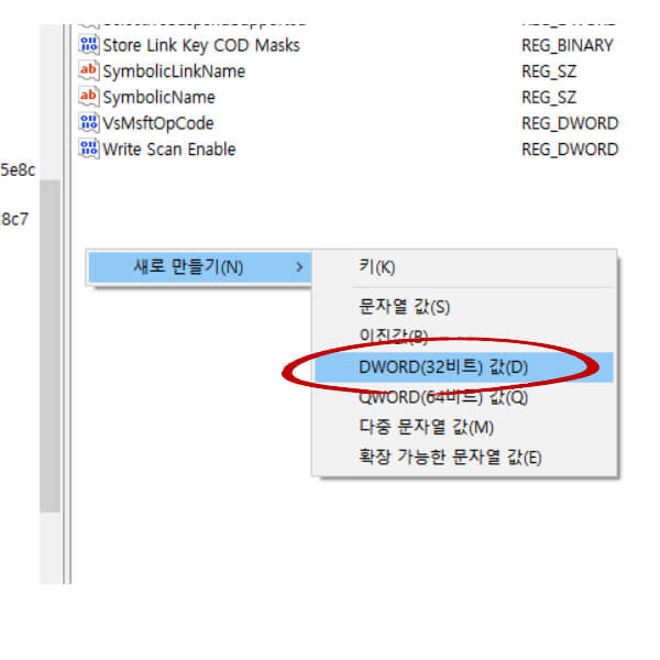 DWORD(32비트)를 선택하면 '새 값 #1'이라는 레지스트리가 생성되고 이를 아래 2개 이름으로 수정하여 생성합니다.