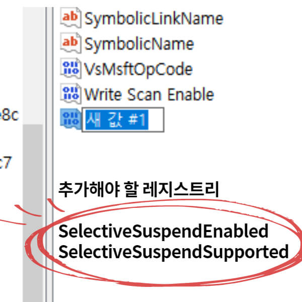 ③ Device Parameters 폴더에 DeviceSelectiveSuspended의 값을 0으로 변경