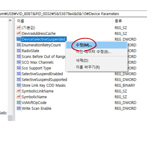 해당 폴더에 레지스트리 중 DeviceSelectiveSuspended에 마우스 커서를 위치하고 마우스 오른쪽 키를 눌러 나타나는 메뉴에서 '수정'을 선택합니다.