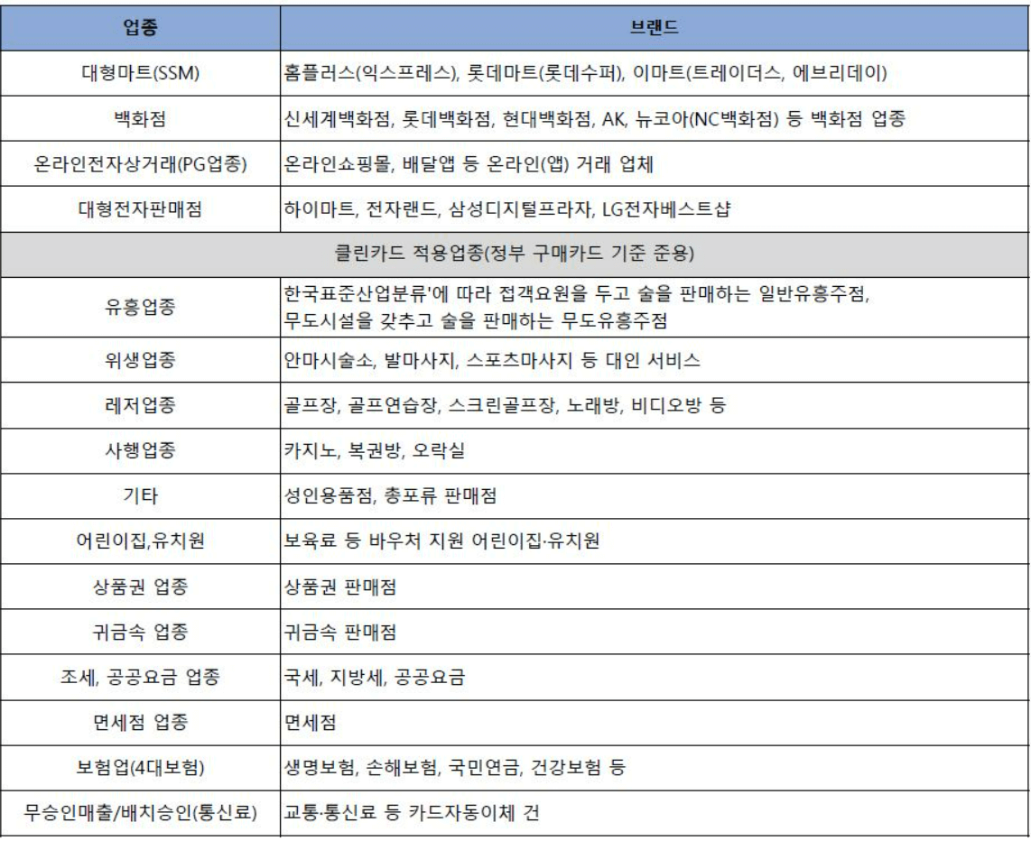 이마트, 홈플러스 등 대형마트와 온라인 쇼핑몰, 백화점, 사행업종, 유흥업소, 공공요금, 보험 등은 사용할 수 없습니다.