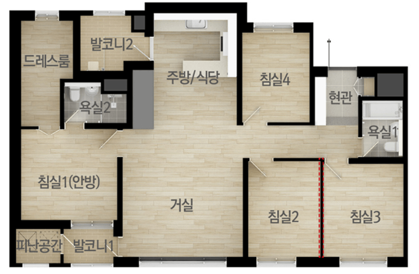 안방 고급형 드레스룸이 410만 원(B타입은 510만 원) 주방 수납장 50만 원, 비스포크 냉장고 295만 원, 인덕션 125만 원 등 폭리 마진을 취하는 느낌이라 별로입니다.