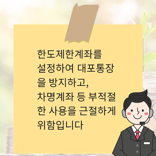 한도제한계좌를 설정하면서 대포통장을 방지하고, 차명계좌 등 부적절한 사용을 근절하게 위함입니다. 특히 신규계좌 개설을 하면 계좌 사용 목적에 맞게 서류를 제출해야 하고, 만약 기준을 충족하지 못하거나 그냥 계좌를 개설하는 경우에는 한도제한계좌로만 개설할 수 있습니다.