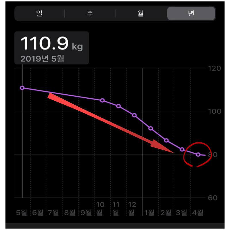 최고 체중은 110kg 었는데, 운동을 처음 시작할 때는 눈에 띄는 변화가 적었습니다. 이때 포기할 수 있는데요. 이때를 견뎌내면 체중이 눈에 띄게 줄게 되는 것을 확인할 수 있습니다.