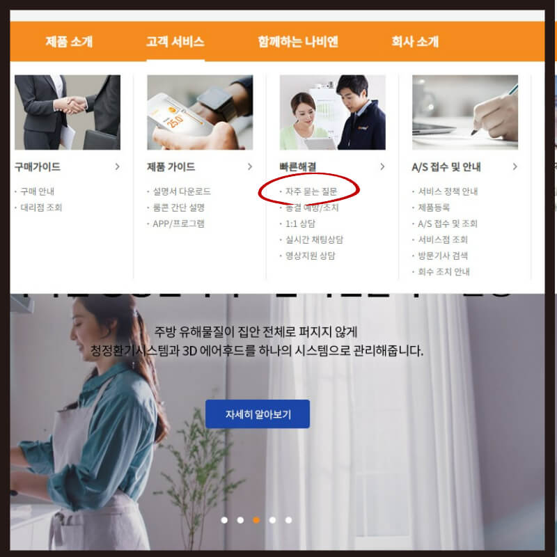 경동나비엔 홈페이지 -> 고객서비스 -> 빠른해결 -> 자주 묻는 질문을 차례로 선택합니다.