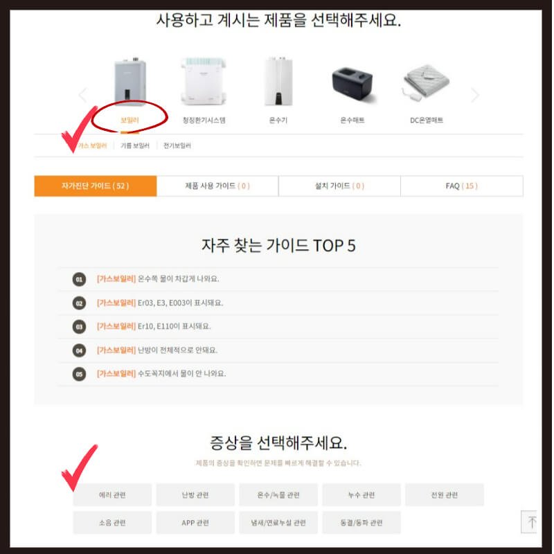 보일러 종류를 선택 후 '증상을 선택해주세요' -> 에러관련을 선택합니다.