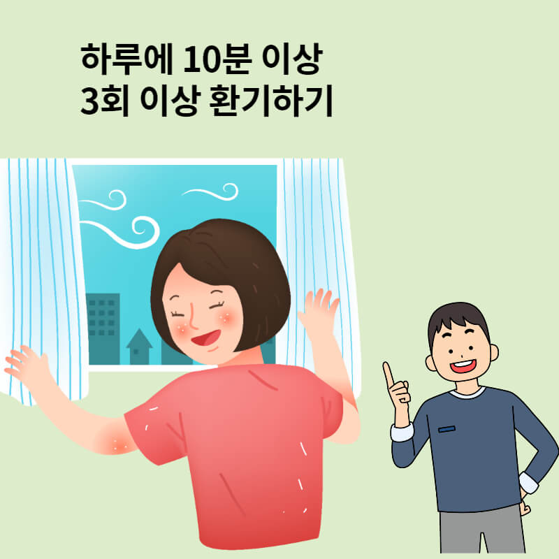 실내 환기는 아침과 저녁으로 30분 정도 해주는 것이 좋습니다. 환기는 호흡기 건강에도 큰 도움이 되니 반드시 해주시기 바랍니다.