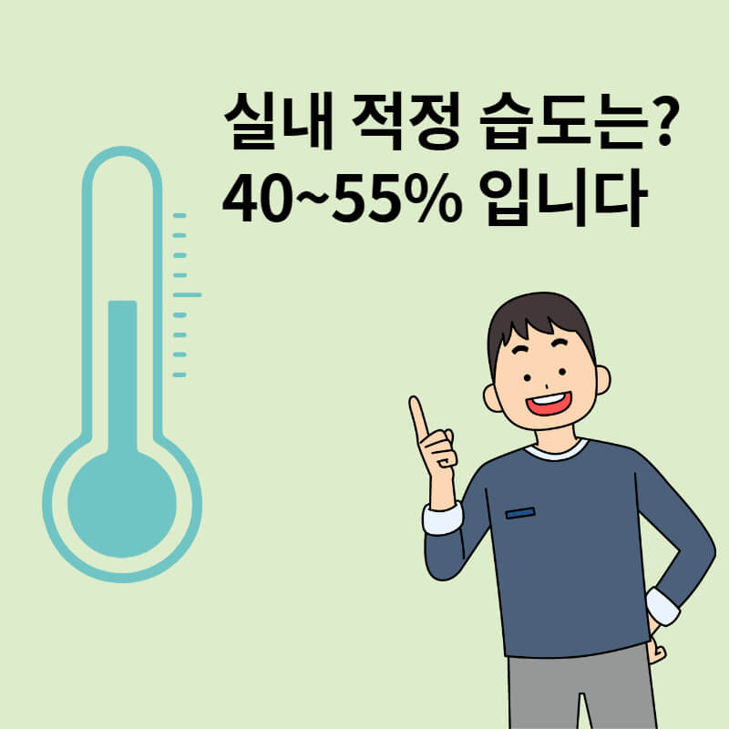 겨울철 적정 습도는 40~55% 정도입니다. 습도가 40% 이하일떄는 바이러스 활동이 활발해지고, 55% 이상일때는 곰팡이가 서식하게 됩니다.